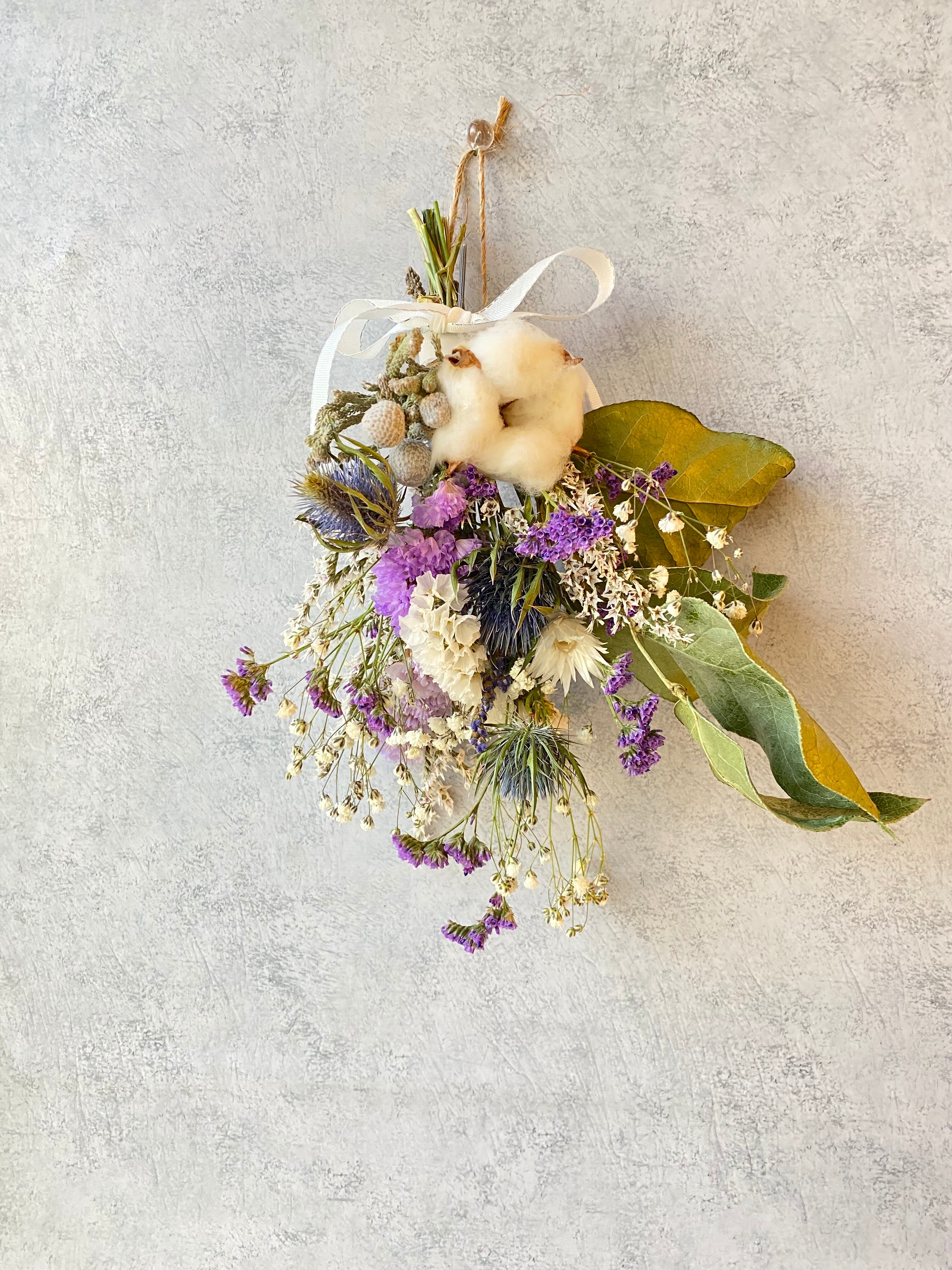 人気のブルー&ホワイト パープルのお花にシルバーブルニア コットンを合わせたスワッグブーケです。