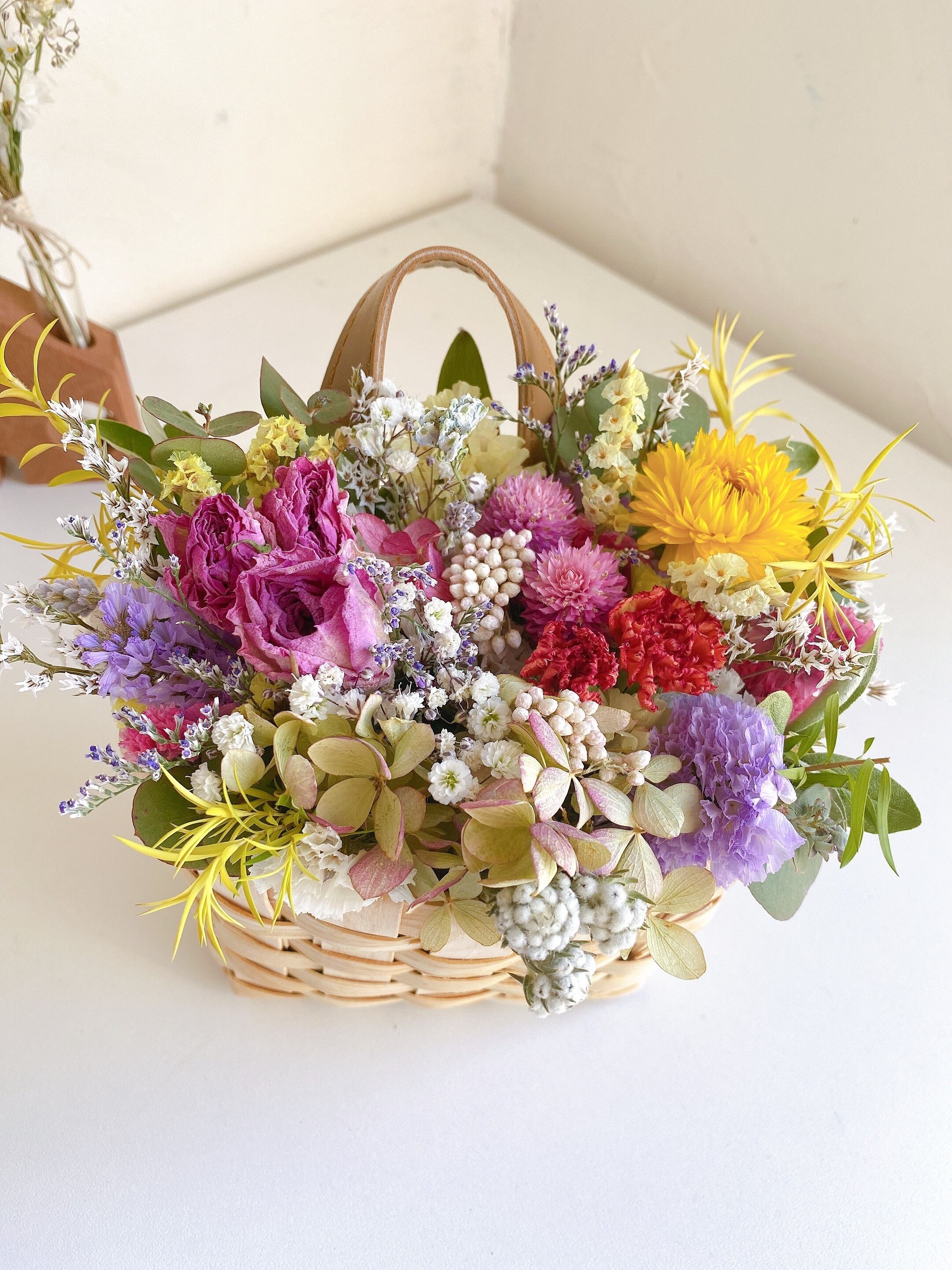 たくさんのお花をギュッとカゴのバスケットにつめた