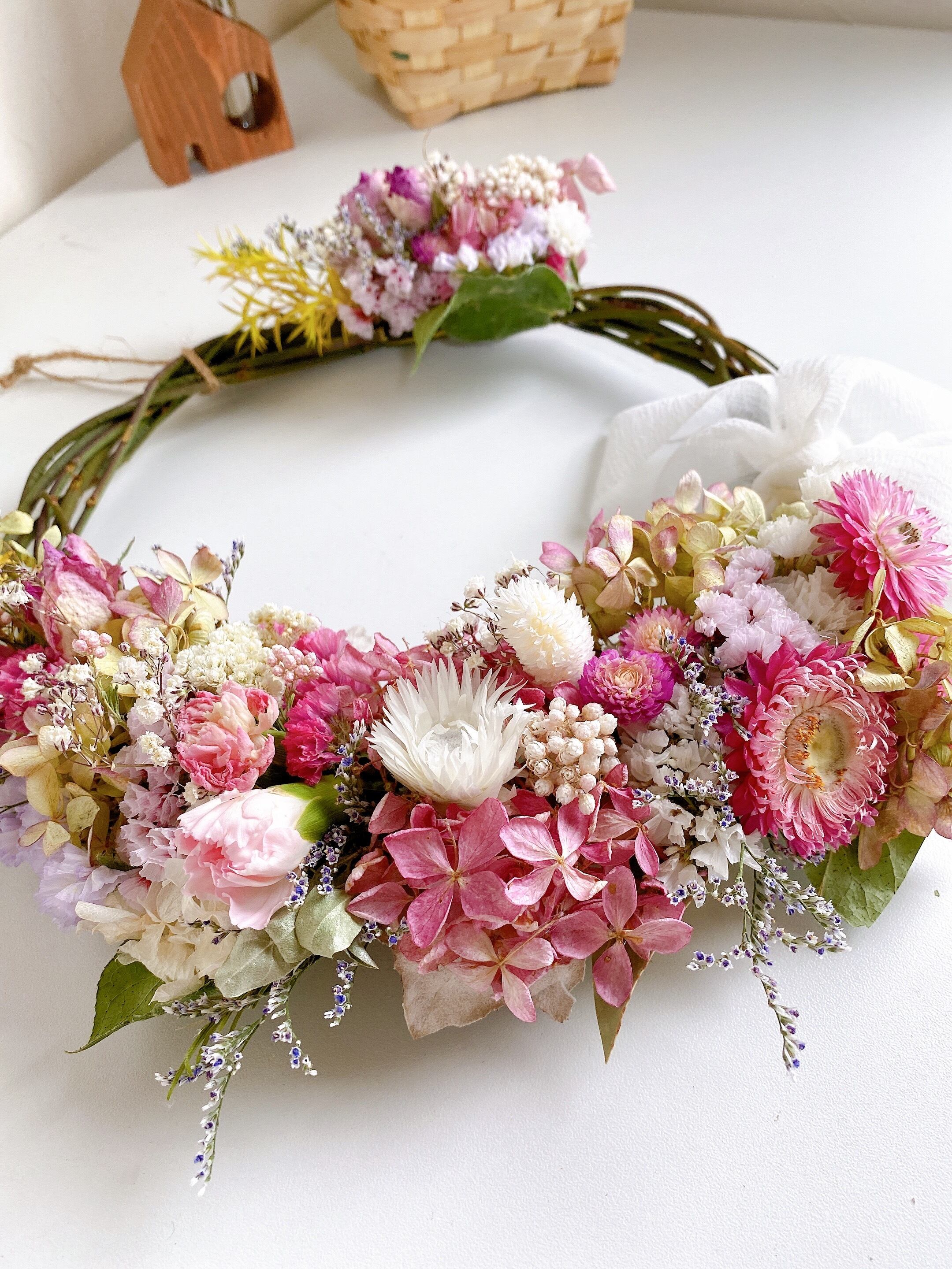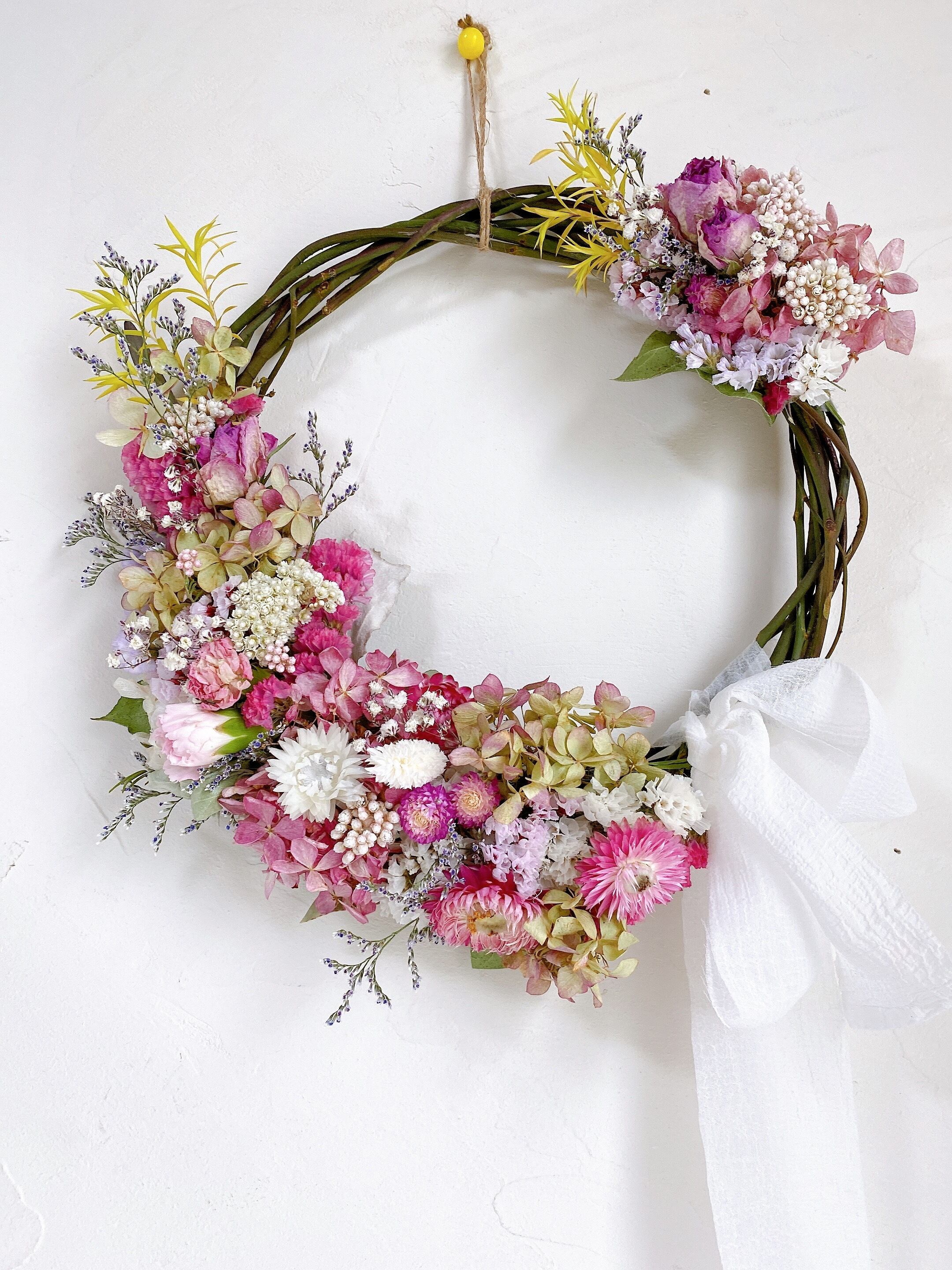 ドライフラワー で春の野原をイメージしたカラーで仕上げたリースです。