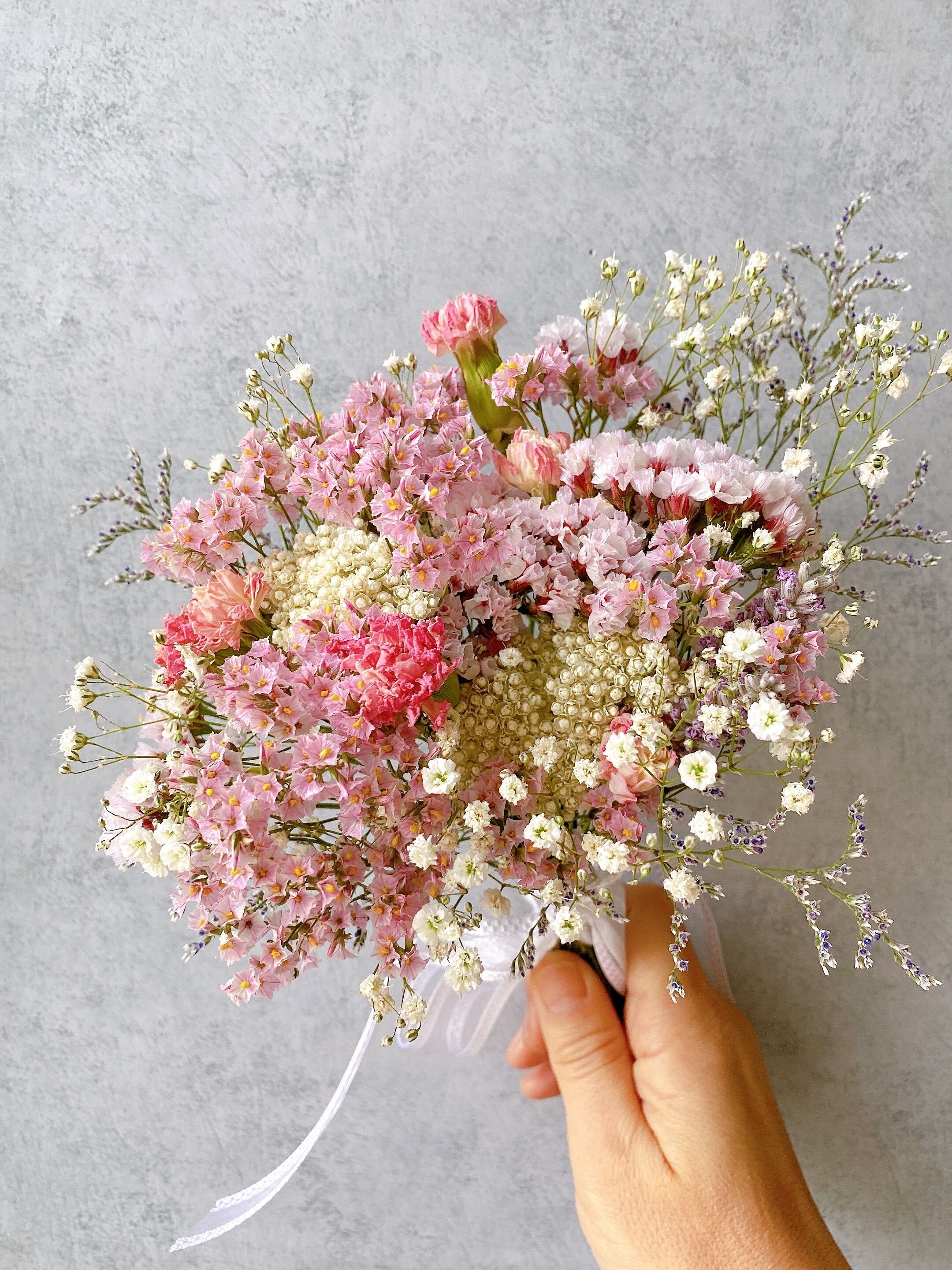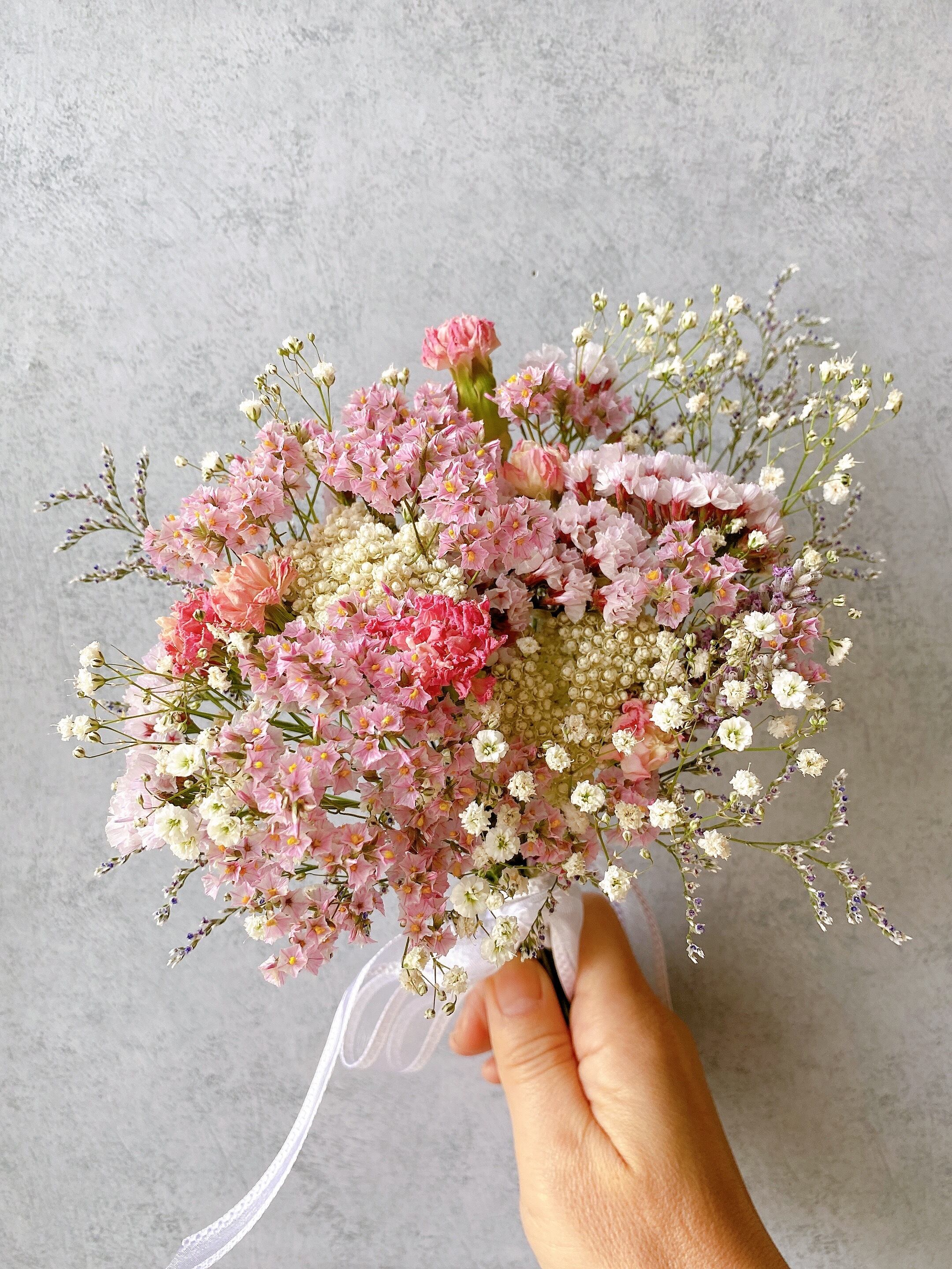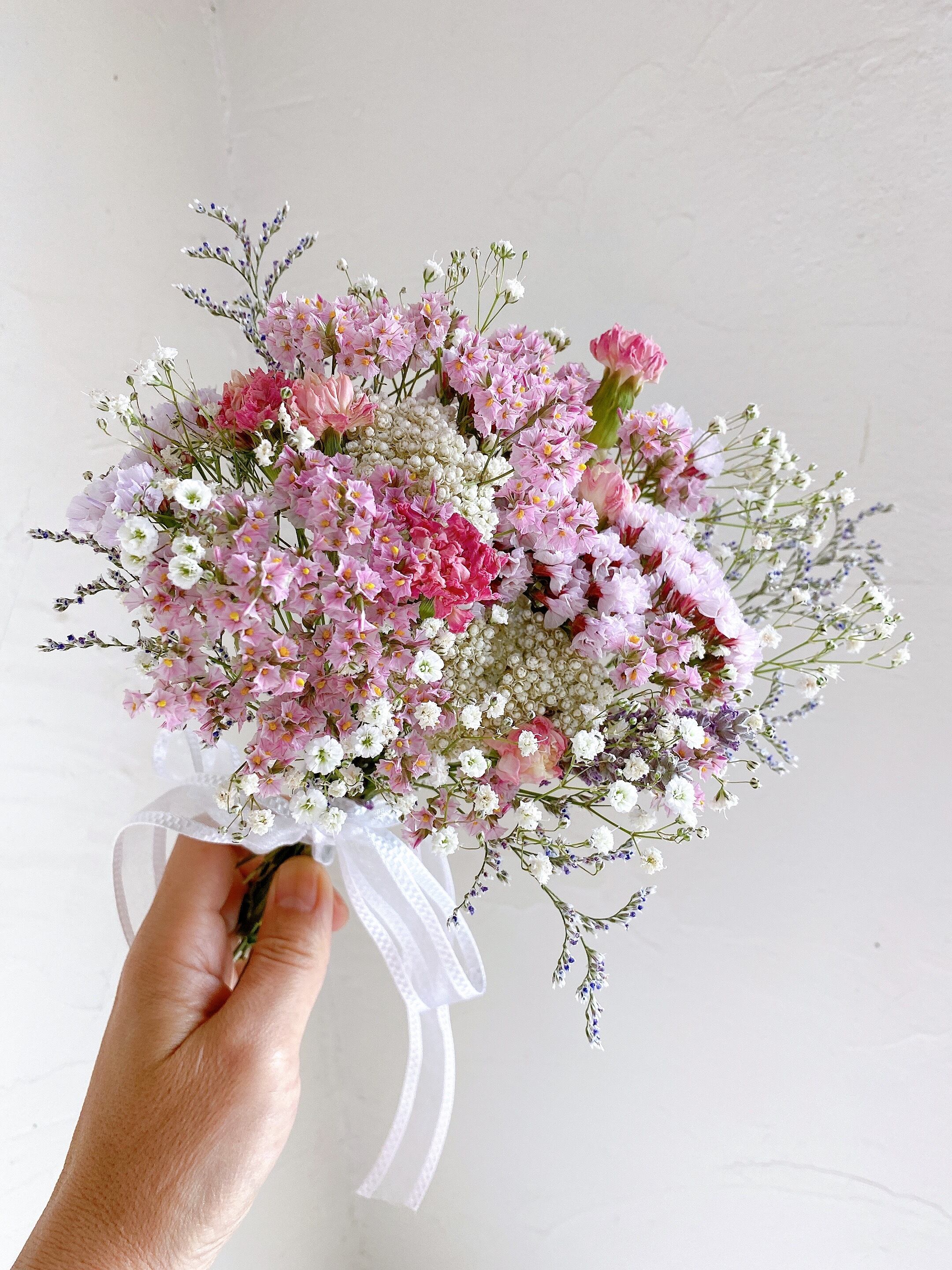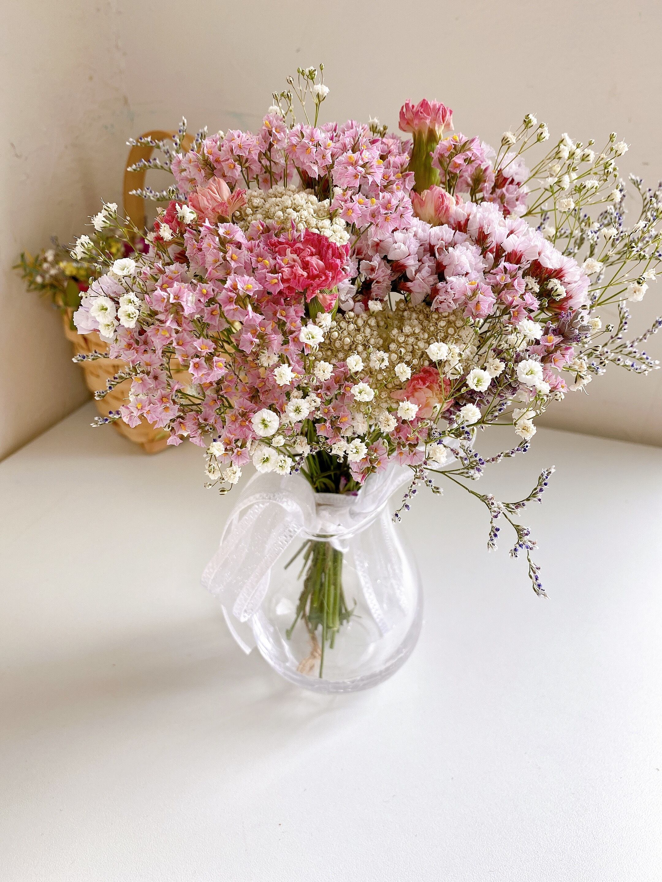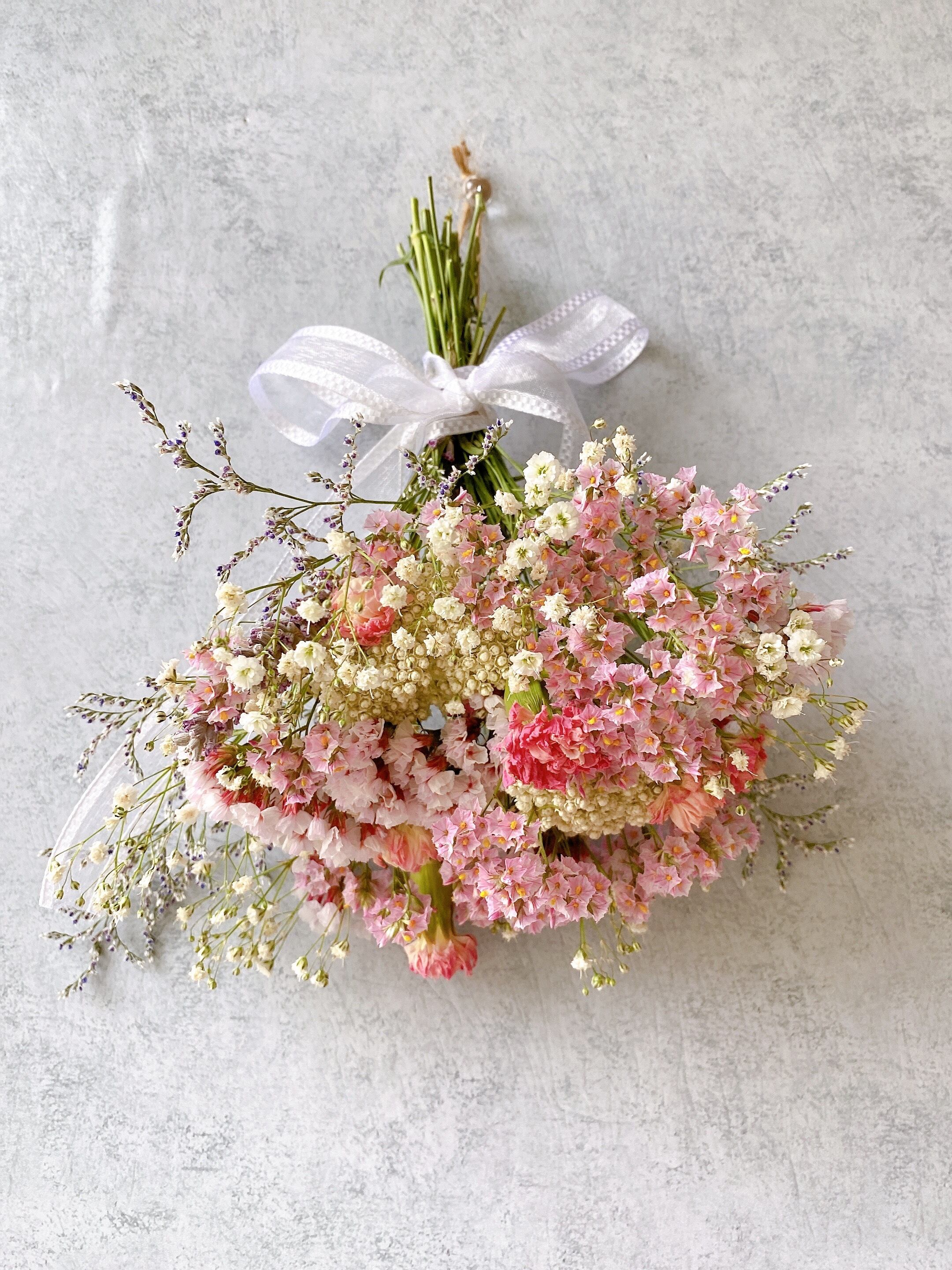 ピンクカラーのカーネーションカスミソウ スターチス ピンクラベンダーを合わせた シンプルでガーリーな雰囲気です