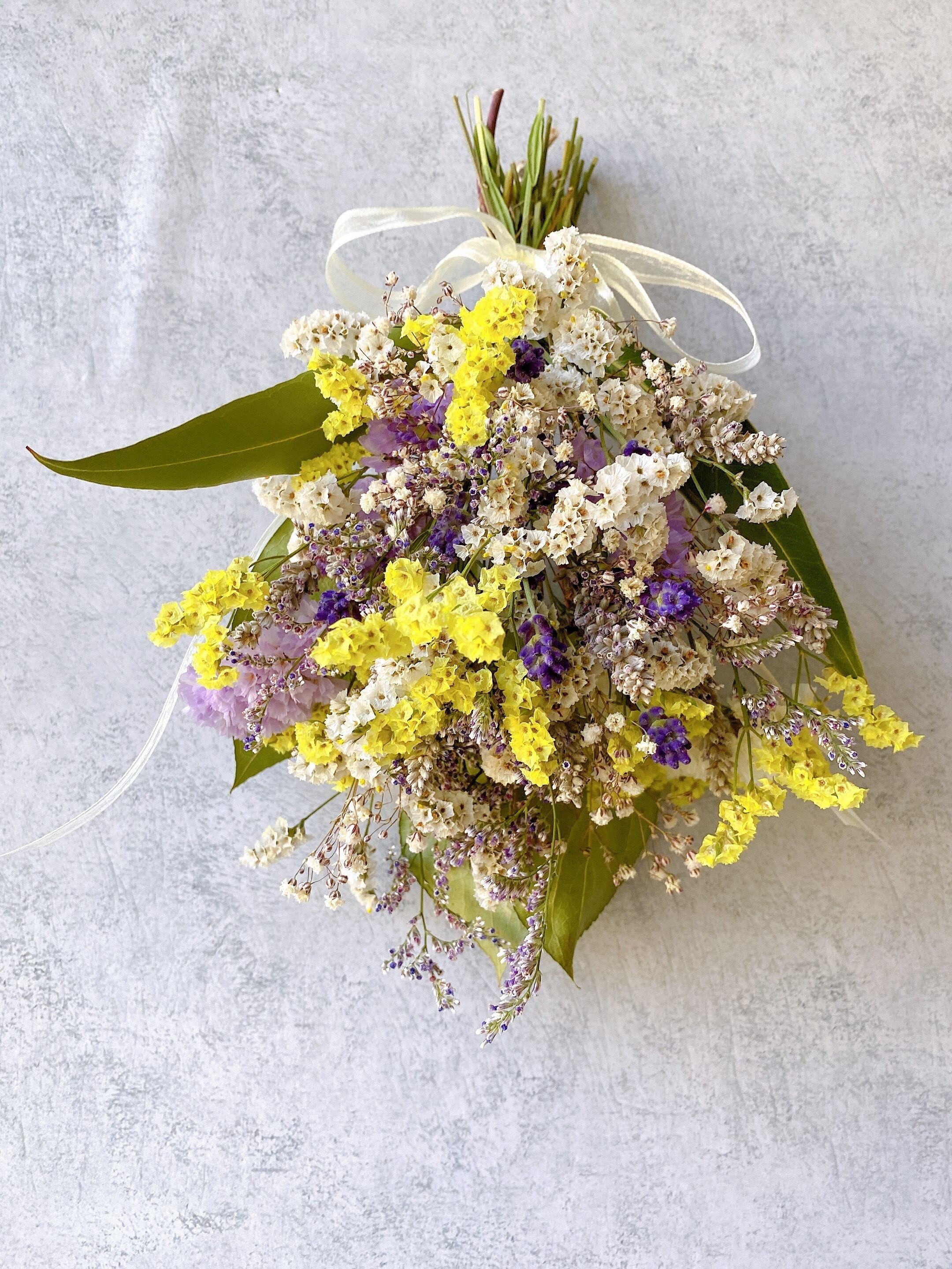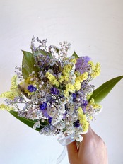 ブルー パープルとイエロー ホワイトの可愛らしい繊細な小花を涼しげに合わせたsummerスワッグブーケです。