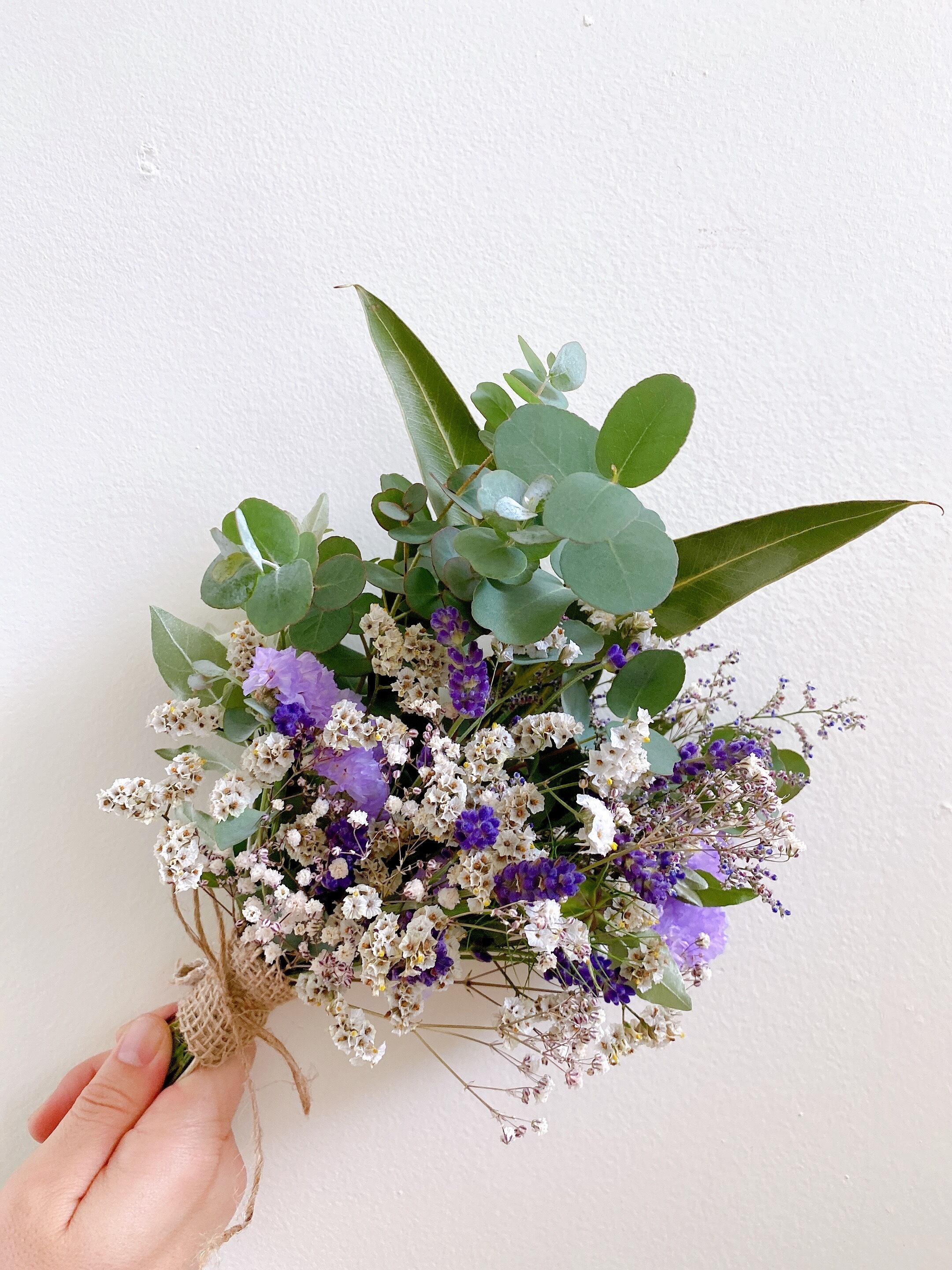 ブルー パープルとホワイト グリーンの可愛らしい繊細な小花を涼しげに合わせたsummerスワッグブーケです。