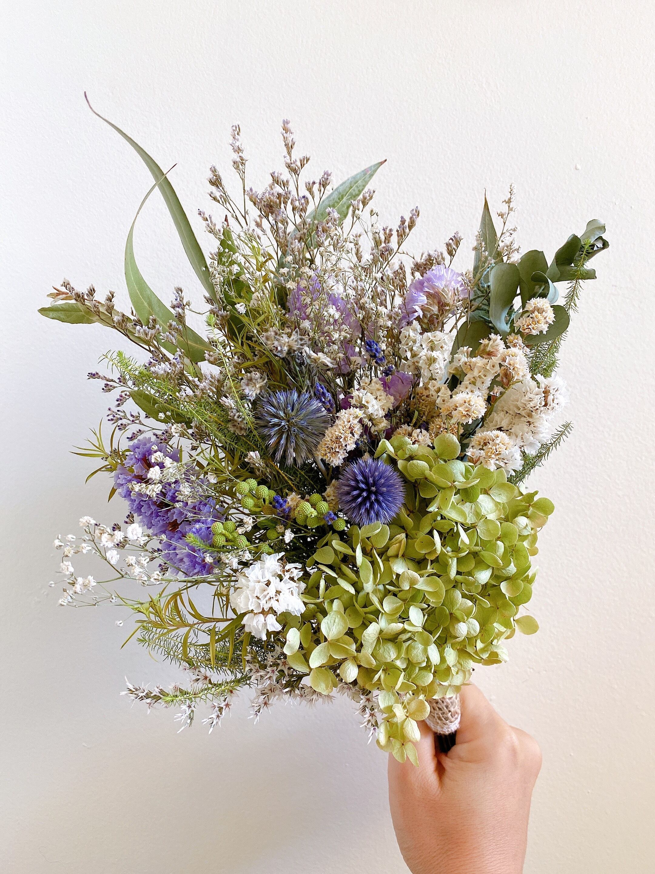 初夏のグリーンと淡い若草色に爽やかなブルー パープルホワイトを合わせた スワッグブーケです。