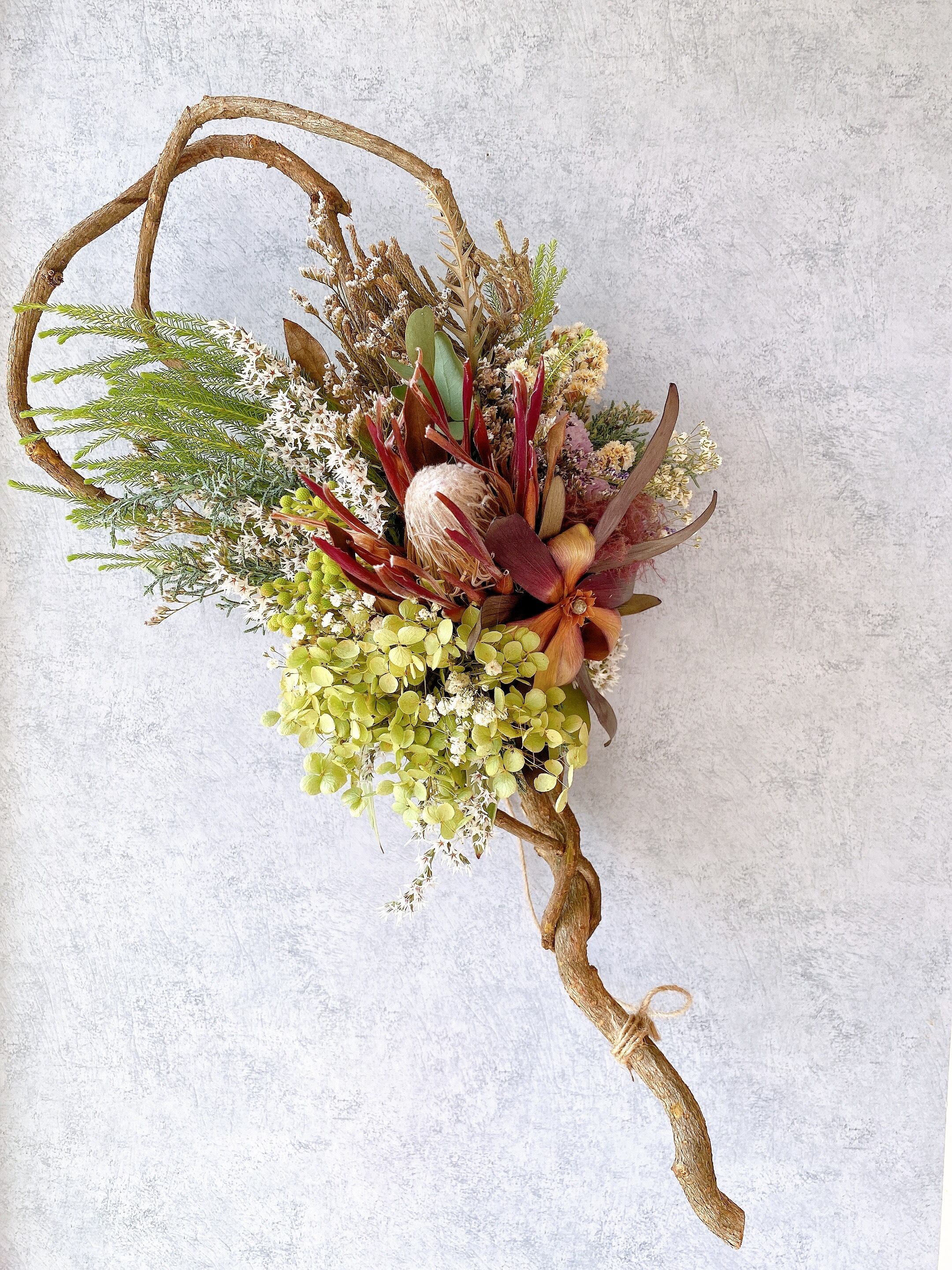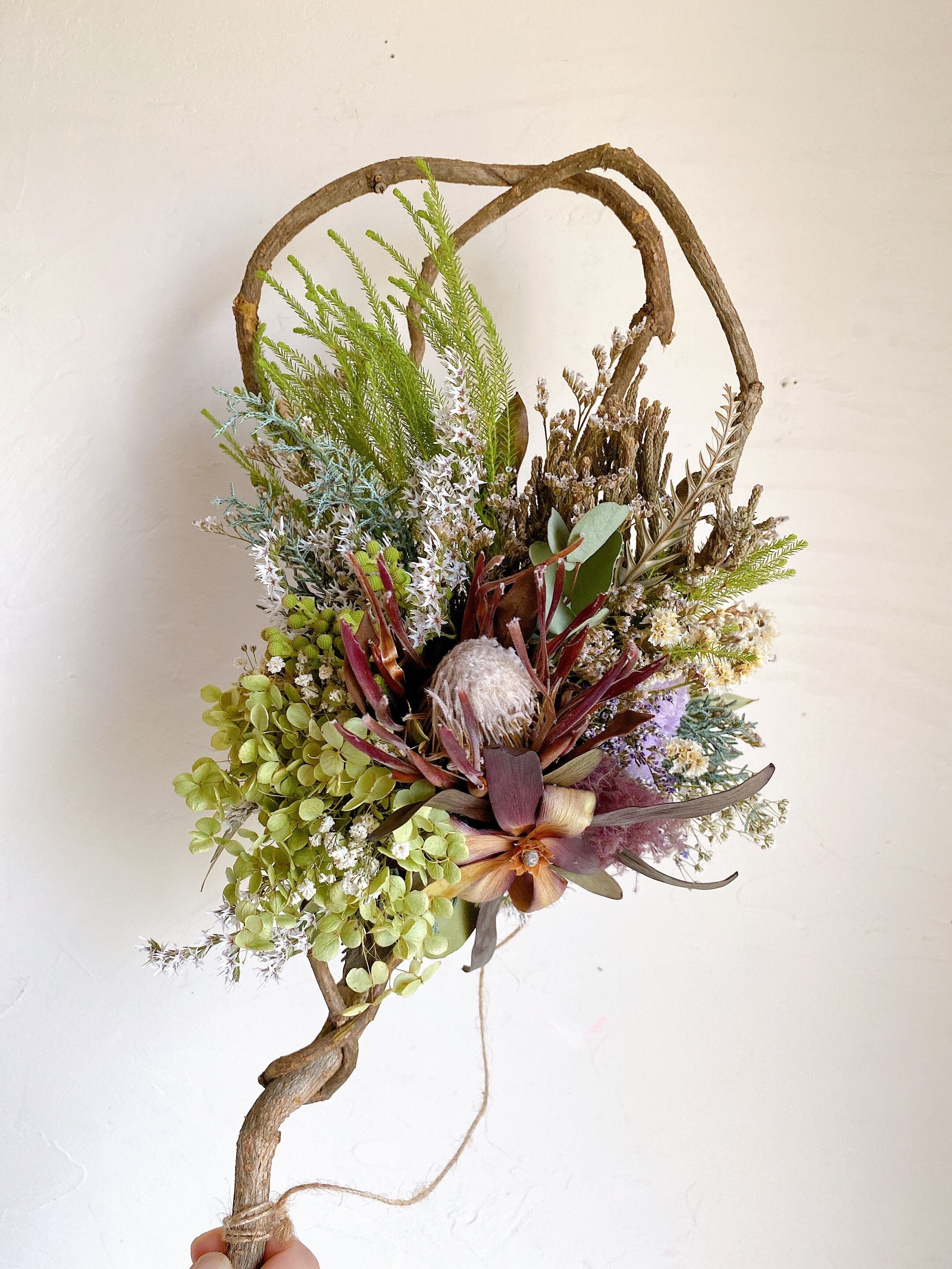 ネイティブフラワーや夏らしいドライフラワーを盛りだくさんに入れ束ねました。